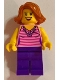 Woman, Striped Pink Shirt with Flower Necklace, Dark Purple Legs, Dark Orange Female Hair Short Swept Sideways