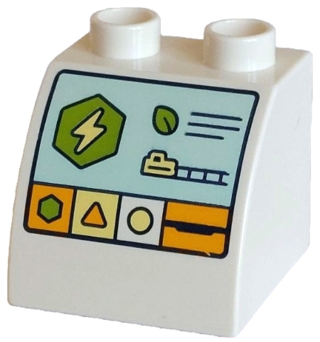 Duplo, Brick 2 x 2 x 1 1/2 Slope Curved with Light Aqua Electric Charger Screen with Lime Hexagon, Bright Light Orange Triangle, Bright Light Yellow Circle, Lightning Bolt, Leave, Train Locomotive on Track Pattern