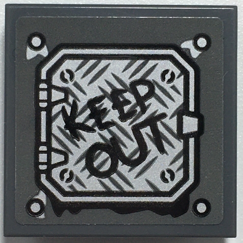 Tile, Modified 2 x 2 Inverted with Black 'KEEP OUT' on Silver Tread Plate Panel Pattern (Sticker) - Set 70435