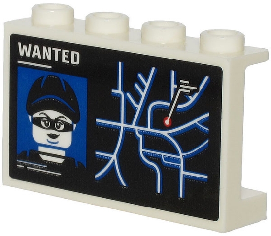 Panel 1 x 4 x 2 with Side Supports - Hollow Studs with White 'WANTED', Minifigure on Wanted Poster and City Map Pattern (Sticker) - Set 60245