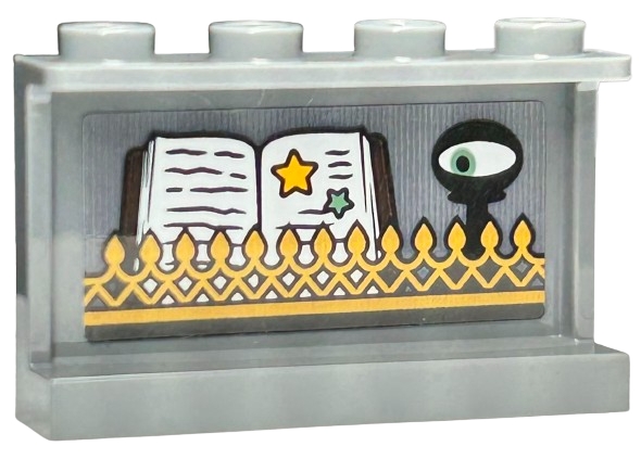 Panel 1 x 4 x 2 with Side Supports - Hollow Studs with Gold Ornate Fence with Spikes, Sand Green Eye in Black Stand, Open Book with Writing and Stars Pattern (Sticker) - Set 76411