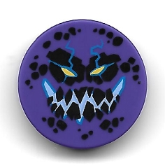 Tile, Round 2 x 2 with Bottom Stud Holder with Black Rock Teeth and Spots, Narrowed Yellow Eyes, Blue Electrified Evil Smile (Bouldron) Pattern