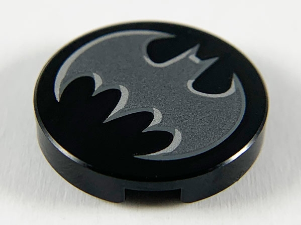 Tile, Round 2 x 2 with Bottom Stud Holder with Dark Silver Bat with Silver Edges Batman Logo Pattern