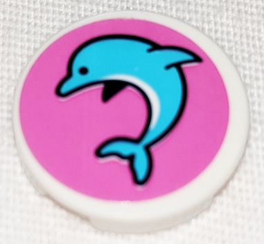 Tile, Round 2 x 2 with Bottom Stud Holder with Medium Azure Jumping Dolphin on Dark Pink Background Pattern Model Left Side (Sticker) - Set 41347