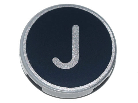 Tile, Round 2 x 2 with Bottom Stud Holder with Silver Capital Letter J on Black Background Pattern