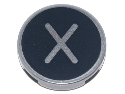 Tile, Round 2 x 2 with Bottom Stud Holder with Silver Capital Letter X on Black Background Pattern