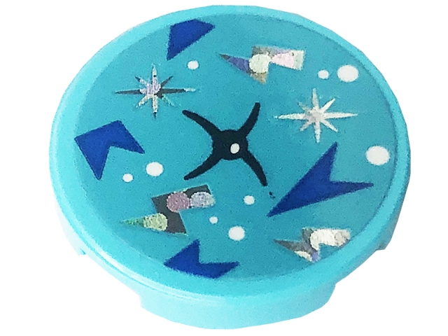 Tile, Round 2 x 2 with Bottom Stud Holder with Cushion with Black Button, White Dots, Blue Arrows, Holographic Stars and Lightning Bolts Pattern (Sticker) - Set 41708