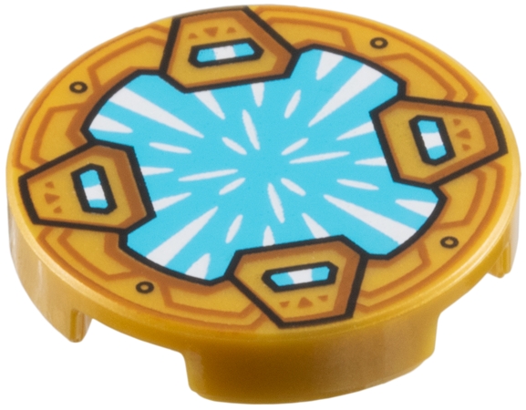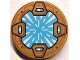Tile, Round 2 x 2 with Bottom Stud Holder with Medium Azure Crystal with White Radiating Reflections, Clasps with Dark Orange Shapes Pattern