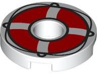 Tile, Round 2 x 2 with Hole with Red Life Preserver with Black Loops and String Pattern