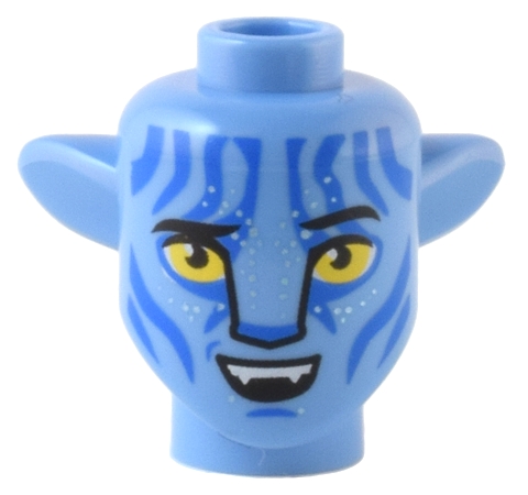 Minifigure, Head, Modified Alien Na'vi with Yellow Eyes, Silver Spots, Blue Markings, Open Mouth Smile with Top Teeth Pattern