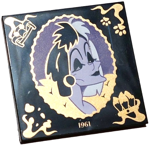 Tile 4 x 4 with Lavender and Dark Purple Cruella De Vil Portrait in Scalloped Oval Frame with Gold Filigree, '1961', Panther De Ville Car, Dalmatian Dog Paws, Spots and Tails Handbag Pattern