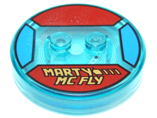 Dimensions Toy Tag 4 x 4 x 2/3 with 2 Studs and Trans-Light Blue Bottom with Gold 'MARTY MC FLY' and Broken Arrow on Red Background Pattern (Marty McFly)