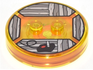 Dimensions Toy Tag 4 x 4 x 2/3 with 2 Studs and Trans-Orange Bottom with Black Video Game Joystick on Dark Bluish Gray and Light Bluish Gray Wood Boards Background Pattern (Jake the Dog)