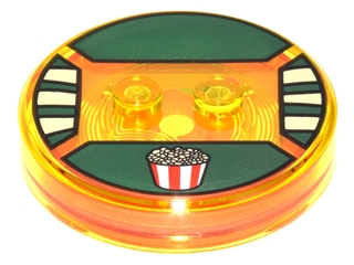 Dimensions Toy Tag 4 x 4 x 2/3 with 2 Studs and Trans-Orange Bottom with Red and White Popcorn Bucket on Dark Green Background Pattern (Stripe)