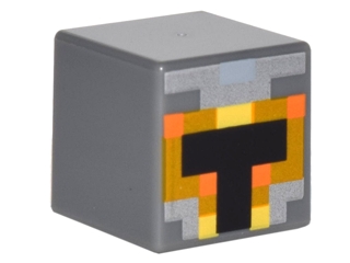 Minifigure, Head, Modified Cube with Pixelated Orange, Silver and Yellow Knight Helmet with Black Opening Pattern (Minecraft Skin)