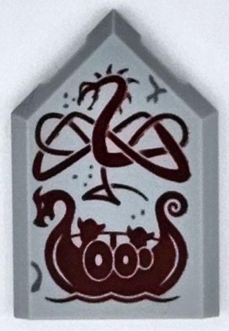 Tile, Modified 2 x 3 Pentagonal with Dark Red Dragon and Viking Ship Pattern