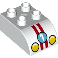 Duplo, Brick 2 x 3 Slope Curved with Yellow Headlights, Red Stripes, and Number 1 on Medium Azure Circle Pattern