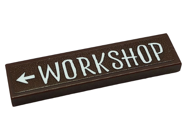 Tile 1 x 4 with White 'WORKSHOP' and Arrow Pattern (Sticker) - Set 10275
