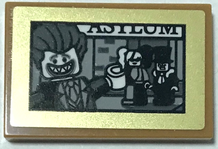 Tile 2 x 3 with Picture of The Joker, Harley Quinn and Penguin Minifigures and 'ASYLUM' in Gold Frame Pattern (Sticker) - Set 70922