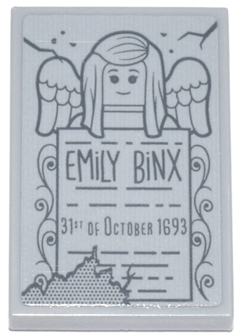 Tile 2 x 3 with Tombstone with Dark Bluish Gray 'EMiLY BiNX 31ST OF OCTOBER 1693' and Angel Minifigure with Wings Pattern (Sticker) - Set 21341