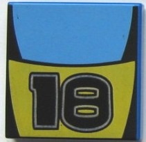 Tile 2 x 2 with Black '18' on Yellow Curved Panel, Medium Blue Thick Stripe Pattern