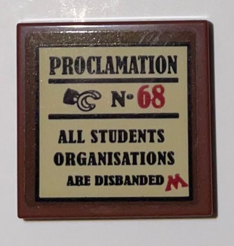 Tile 2 x 2 with Black and Red 'PROCLAMATION No. 68', Minifigure Hand, Text, and Letter M on Tan Background Pattern (Sticker) - Set 75966