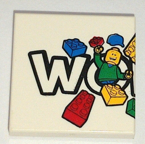 Tile 2 x 2 with LEGO World Logo Left Half, 'WO', Minifigure with Blue Cap, 4 Whole Bricks and Plain Corner Pattern