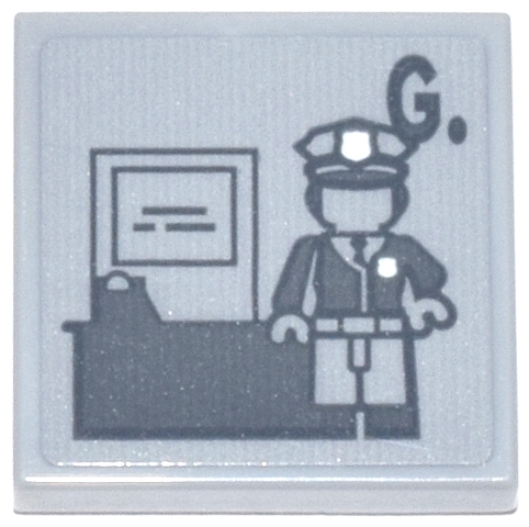 Tile 2 x 2 with Dark Bluish Gray Police Officer Renee Montoya Minifigure with 'G.', Desk and White Badges Pattern (Sticker) - Set 76271