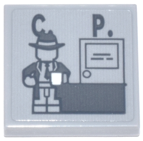 Tile 2 x 2 with Dark Bluish Gray Detective Harvey Bullock Minifigure with Desk, 'C.' and 'P.' Pattern (Sticker) - Set 76271