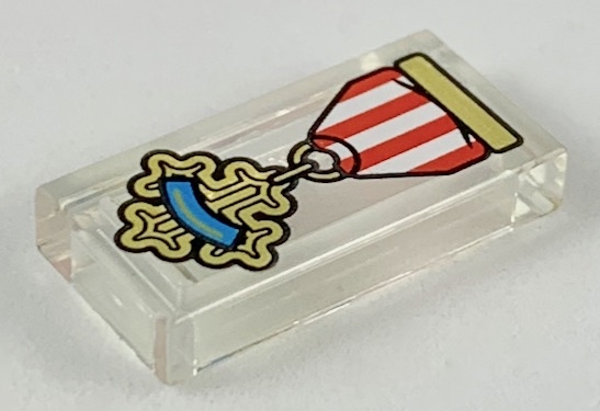 Tile 1 x 2 with Red and White Ribbon, Gold Cross Medal with Dark Azure Stripe Pattern