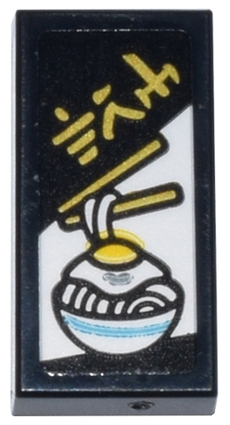 Tile 1 x 2 with White Ramen Noodles with Yellow Egg in Bowl with Medium Azure Stripe, Gold Chopsticks and Ninjago Logogram 'TRY' Pattern (Sticker) - Set 71837