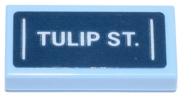 Tile 1 x 2 with Dark Blue Street Sign with White 'TULIP ST.' and Vertical Lines Pattern (Sticker) - Set 42671