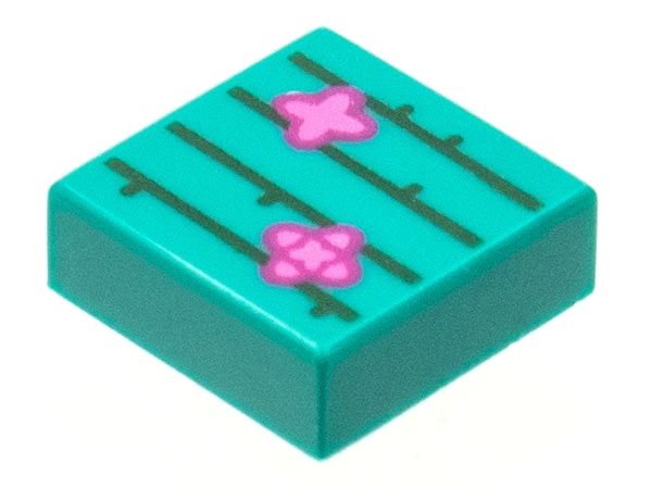 Tile 1 x 1 with Dark Green Cactus Lines, Magenta and Dark Pink Flowers Pattern