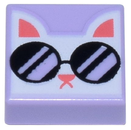 Tile 1 x 1 with White Cat Head with Black Sunglasses and Coral Ears, Nose, and Mouth Pattern