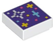Tile 1 x 1 with Pixelated Coral, Medium Azure, White, and Yellow Stars and Dots on Dark Purple Background Pattern