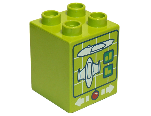 Duplo, Brick 2 x 2 x 2 with Computer Screen with Spaceship and White Arrows and Red Button Pattern