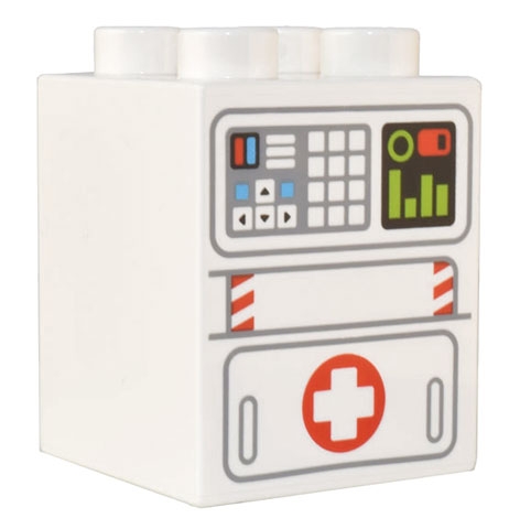 Duplo, Brick 2 x 2 x 2 with Light Bluish Gray Mechanical Panel with Arrows and Keypad, Lime Display and Red Power Meter, and Red Cross Door Pattern