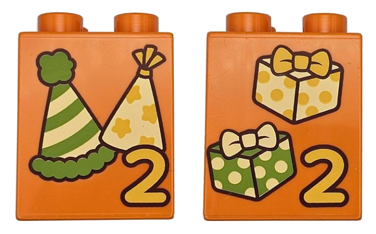 Duplo, Brick 2 x 2 x 2 with Number 2 and Bright Light Yellow, Yellow and Lime Party Hats with Stripes and Stars / Presents / Gifts with Bows Pattern