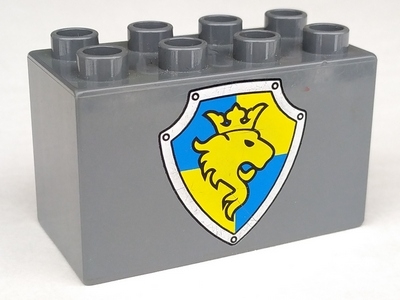 Duplo, Brick 2 x 4 x 2 with Shield - Lion and Crown on Yellow and Blue Pattern