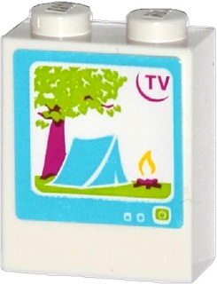 Brick 1 x 2 x 2 with Inside Stud Holder with 'TV', Tree, Tent and Campfire on Screen Pattern (Sticker) - Set 41034