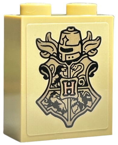 Brick 1 x 2 x 2 with Inside Stud Holder with Copper Capital Letter H, Dark Tan Hogwarts Crest, Helmet and Plume Feathers Pattern (Sticker) - Set 76415