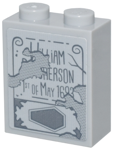 Brick 1 x 2 x 2 with Inside Stud Holder with Tombstone with Dark Bluish Gray Coffin and 'WiLLiAM BUTCHERSON 1ST OF MAY 1693' Pattern (Sticker) - Set 21341