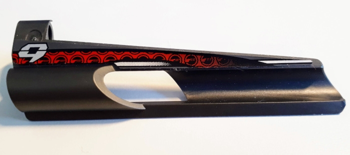 Technic, Panel Fairing # 8 Small Long, Large Hole, Side B with Stylized Silver Number 9 and Black and Red Pattern (Sticker) - Set 8353
