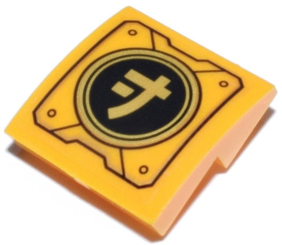 Slope, Curved 2 x 2 x 2/3 Inverted with Mechanical Panel with Ninjago Logogram Letter J on Black and Gold Circle Pattern (Sticker) - Set 71837