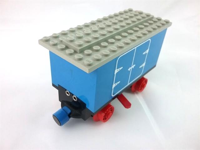 Train Battery Box Car with Two Contact Holes, Red Switch Lever, Blue and Red Magnets, Red Wheels, and Light Gray Roof with Hinged Doors Pattern on Both Sides (Stickers) - Set 7720