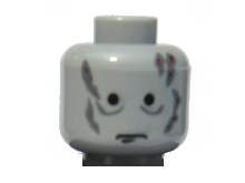 Minifigure, Head without Eyebrows, Dark Bluish Gray Creases Under Eyes, Chin Dimple and Scars, Red Burns Pattern