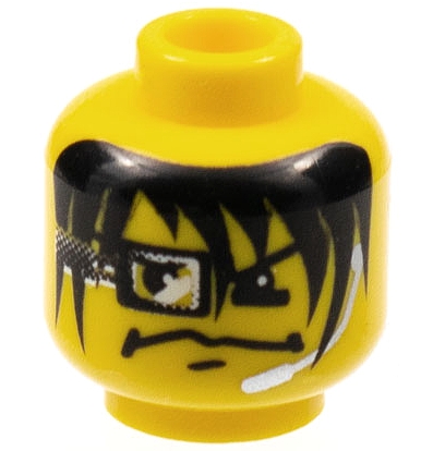 Minifigure, Head Male Grim Expression, Black Hair with Long Bangs, Silver Microphone, and Square Eye Device Pattern (Arrow)