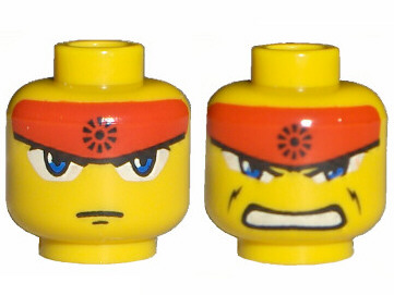Minifigure, Head Dual Sided Exo-Force Blue Eyes, Red Headband, Closed Mouth / Bared Teeth Pattern (Ryo)