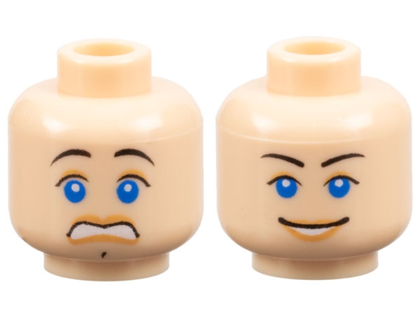 Minifigure, Head Dual Sided Female Black Thin Eyebrows, Blue Eyes, Nougat Lips and Eye Shadow, Scared / Open Mouth Smile with Teeth Pattern