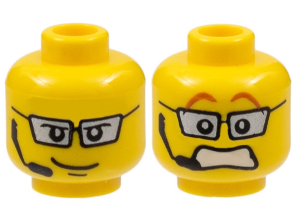 Minifigure, Head Dual Sided Silver Glasses, Headset, Smile / Scared Pattern